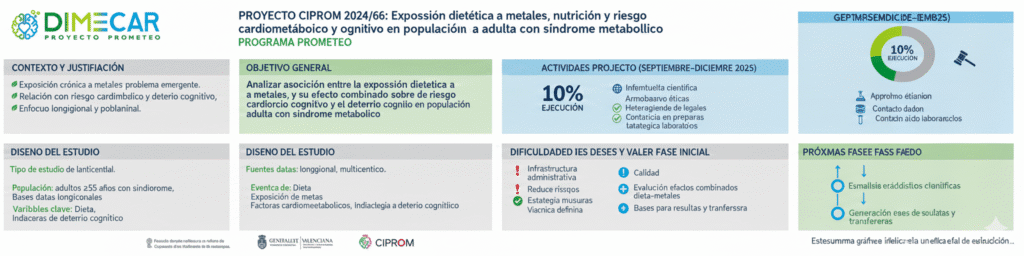 Investigar la asociación transversal entre la ingesta dietética habitual de nutrientes, alimentos y patrones dietéticos saludables (por ejemplo, adherencia a la dieta mediterránea) y la presencia de mezclas de metales en orina, así como evaluar su efecto combinado sobre el riesgo cardiometabólico y el deterioro cognitivo en adultos de 55 años o más con síndrome metabólico, en diferentes momentos temporales: al inicio del estudio, a los seis meses, al año, a los tres años y a los cinco años.